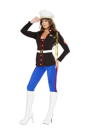 Command attention in this Multi-Colored Marine Corporal Costume, featuring a black button-up jacket with gold buttons, braided aiguillette, and ranking patch detail. Paired with blue pants and a white belt with gold buckle, this look delivers a bold, uniform-inspired style that’s ready for duty at any party or cosplay event.