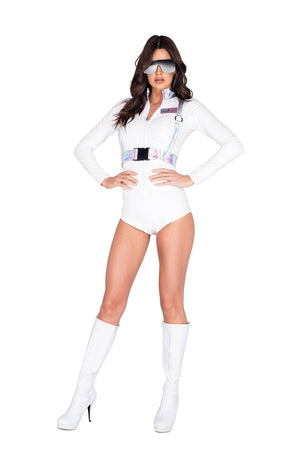 Reach for the stars in this Astronaut Babe costume featuring a long-sleeve white vinyl romper with an American flag patch and a reflective harness that gives major space mission vibes. Perfect for Halloween parties, cosplay events, or any out-of-this-world night.