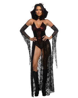 Step into the night with the irresistible allure of the Dark Romance Vampiress. This stunning 4-piece set features a red velvet and sequin gown with a black lace overlay, paired with matching gloves, a dramatic collar, and Brazilian-cut velvet shorts for a seductive finish. Perfect for those who rule the darkness in style.