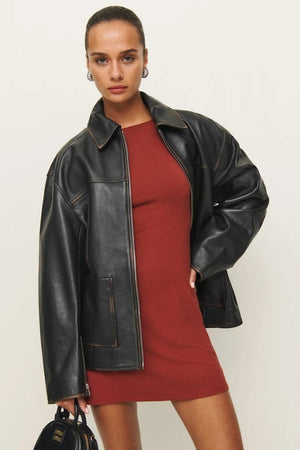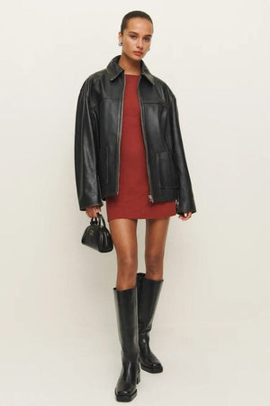 Stay warm out there. Shop the Veda Bennett Oversized Leather Bomber, a sustainable leather jacket from Reformation. Designed to be oversized and relaxed fit throughout. Style intentionally oversized. Size down for a more tailored look.